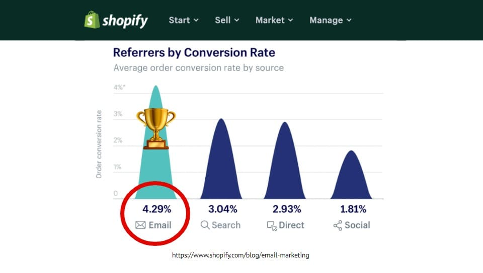 A prova disso é a análise de conversão que a Shopify fez com mais de 1.700.000 empresas, mostrando que o e-mail continua sendo o melhor canal de vendas.
